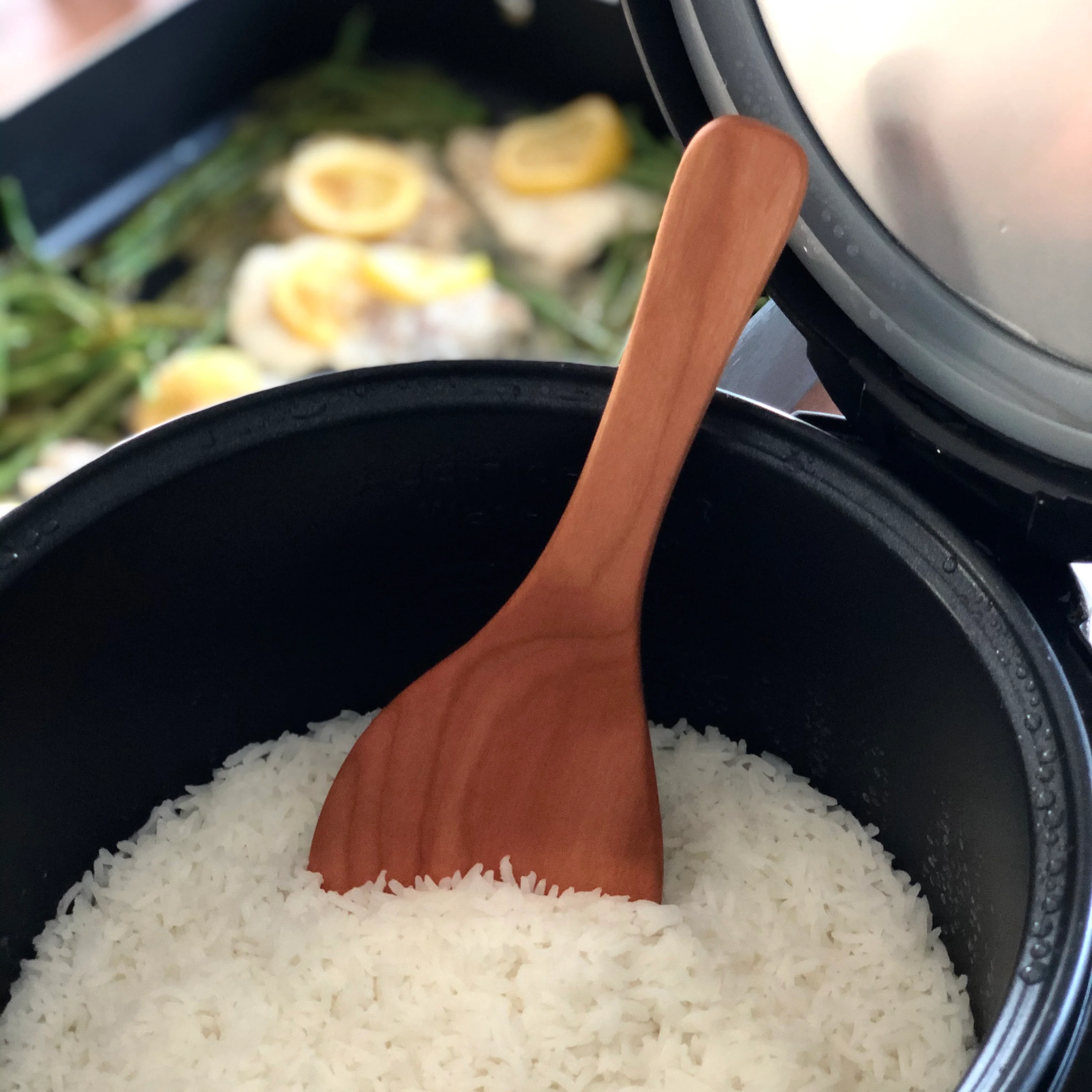 Today, most shamoji are made from wood or plastic and are often included when you purchase a rice cooker. Our rice paddle is made from local American Cherry, Maple, and Walnut and has a large spoon end that allows for scooping generous portions of rice from a rice cooker or from a pot. Using a wooden paddle on rice as opposed to a metal spoon is important as it will not cut rice grains in half when serving and will not scratch the surface of your cooker. When cooking sticky rice, dip your rice paddle in water each time before serving rice to help make your wooden paddle non-stick.